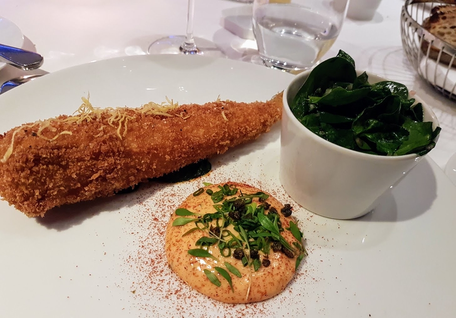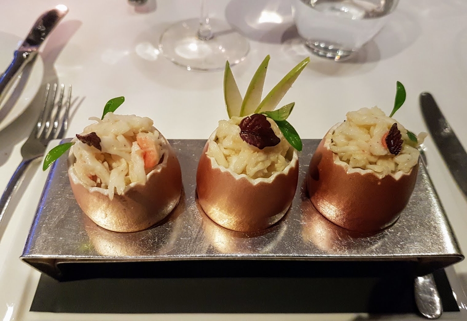 En entrée, les “noix de coquilles saint Jacques à la plancha, jus de cresson au beurre de sarrasin”, juste saisies étaient bien sûr une pure merveille, tandis que les “œufs King Crab, mayo au gingembre citron” se sont révélées, en fait, être de l’excellent king-crabe mayonnaise, fort joliment présenté dans trois coquilles d’œufs en porcelaine dorée. Une jolie présentation qui n’enlève rien à l’affaire et attise réellement la gourmandise.