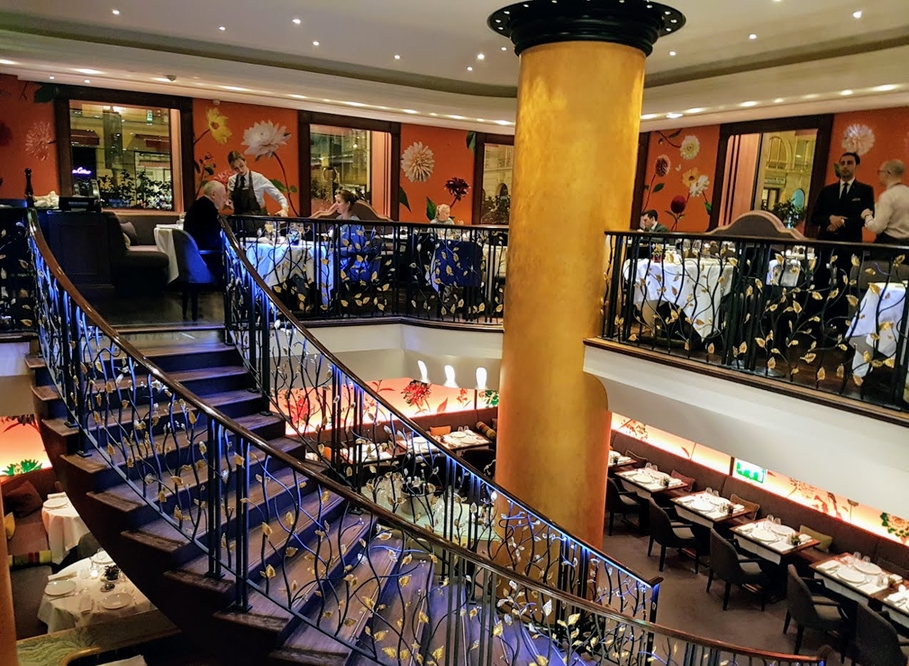 On vous dit que c’est une brasserie, entendu, mais une brasserie chic ! Ne serait-ce qu’à en juger par le décor Art nouveau (vrai ou copié ?) et son élégant escalier central entouré d’une rambarde en fer forgé et feuilles d’acanthe dorées. Les tables, bien distantes les unes des autres, agencées précisément le long de cette rambarde, dominent le lobby. Et pourtant, malgré l’ampleur du volume de la salle, l’atmosphère reste feutrée dans laquelle transpirent à peine quelques notes musicales très discrètes.