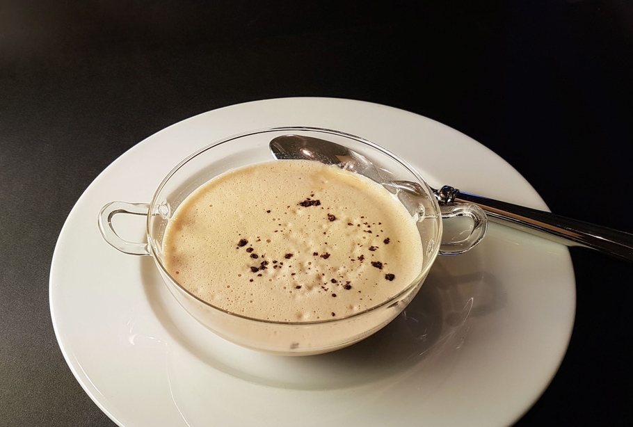 • Velouté de châtaignes au café Une entrée d’hiver de Pierre Gagnaire que je me suis permise de simplifier pour gagner du temps. Le café exhale remarquablement la saveur des châtaignes. Ne négligez pas, si possible, les détails de présentation (un œuf à la neige et mortadelle).