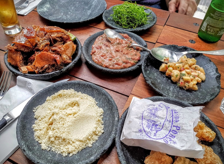 Il s’agit de porc cuit pendant huit heures, servi effiloché avec du ragoût de haricots rouges, un tartare de banane confite dans le citron vert, de la farofa, comme toujours (farine de manioc grillée), des lanières de chou brésilien (qui ressemble comme deux gouttes d’eau au chou kale).