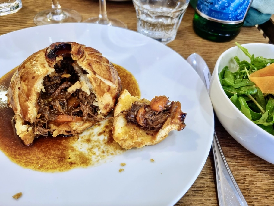 Voilà qu’arrive dans mon assiette un magnifique pâté en croûte rond, brûlant, et fourré d’un bœuf-carottes fondant à souhait. La pâte était une véritable pâte à pâté en croûte, bien ferme. Par ce jour un peu frais, l’essai fut vraiment convaincant. Une jolie salade, bien assaisonnée, était jointe et mon verre de côtières-de-nîmes (Safranée 2020) complétait ce mets typiquement de chez nous.