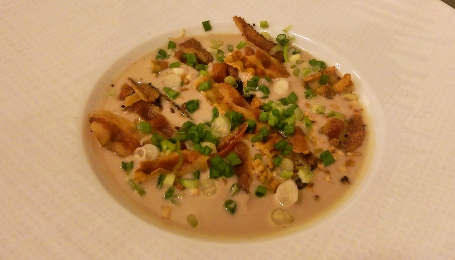 La crème de haddock au curcuma et aux agrumes, radis et haddock en vinaigrette est aussi jolie que délicieuse avec des morceaux de haddock épais et moelleux. Quant au velouté de céleri et châtaignes, surmonté de ventrèche croustillante (bacon) et de noisettes, il est tout simplement à tomber et mérite à lui seul de revenir. Je veux absolument le copier et m’en approcher le mieux possible.