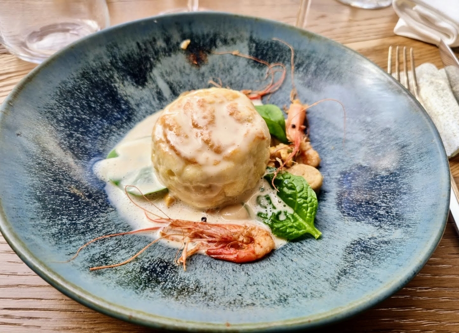• S’en est suivi un soufflé de saint-jacques, sauce dieppoise (crevettes, tombée d’épinards). Cette préparation, plus classique, est une valeur sûre et nous a émoustillé les papilles.