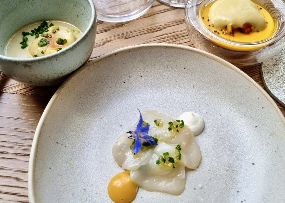 • Pour commencer, nous avons pu apprécier un carpaccio de saint-jacques entouré d’une royale de potiron au corail et d’un consommé tremblotant de barde, comme quoi tout se consomme avec bonheur dans ce mollusque. Décoré d’une fleur de bourrache. Une dégustation tout en finesse.