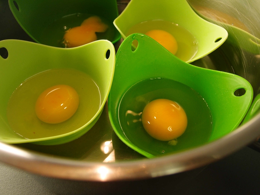 Ces Poachpod ®, vous simplifierez grandement le pochage des œufs : cassez les œufs un par un dans chacun des récipients légèrement huilés et déposez ces derniers dans une grande casserole d’eau frémissante (sans vinaigre, qui devient inutile) pendant 6 minutes.