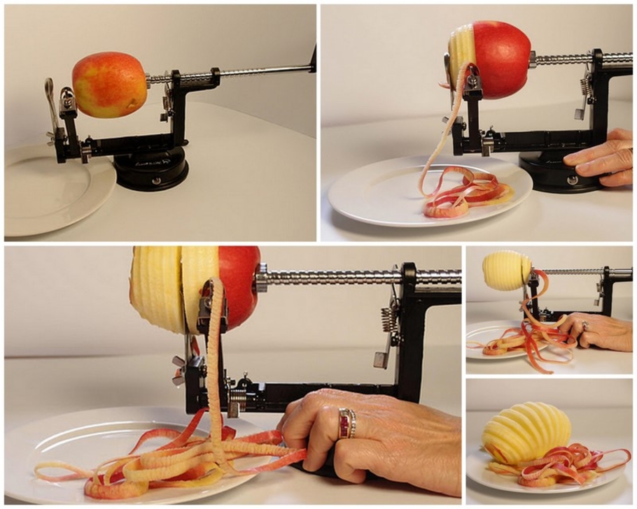 Vous fixez la pomme sur une sorte de vrille, vous tournez la manivelle et la pomme perd sa peau en même temps qu’elle est tranchée en spirale.