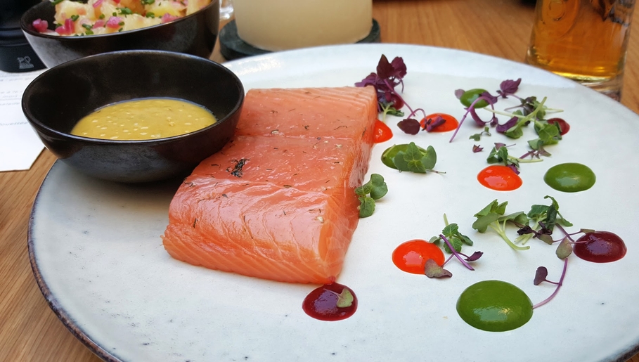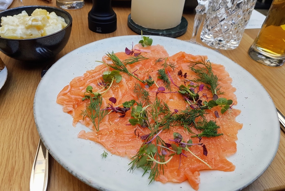 Quant au saumon d’Écosse mariné à l’aneth Gilbert Bécaud, servi avec une salade de pommes de terre à l’échalote tiède (31 euros), c’est une des spécialités du Flora Danica, dont le chanteur raffolait. Au moins avait-il bon goût… Une merveille au palais. Pour vous en approcher, faites mariner un saumon en gravelax, comme Mariatotal.