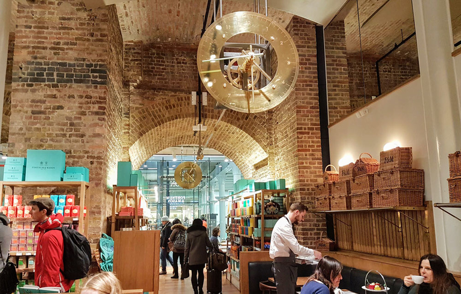 Si vous arrivez à Londres par un Eurostar du matin, vous pouvez commencer par vous mettre dans l’ambiance en dégustant un bon petit déjeuner anglais dans l’antenne de Fortnum & Mason si joliment aménagée derrière des panneaux de verre qui séparent tous les commerces de la gare.