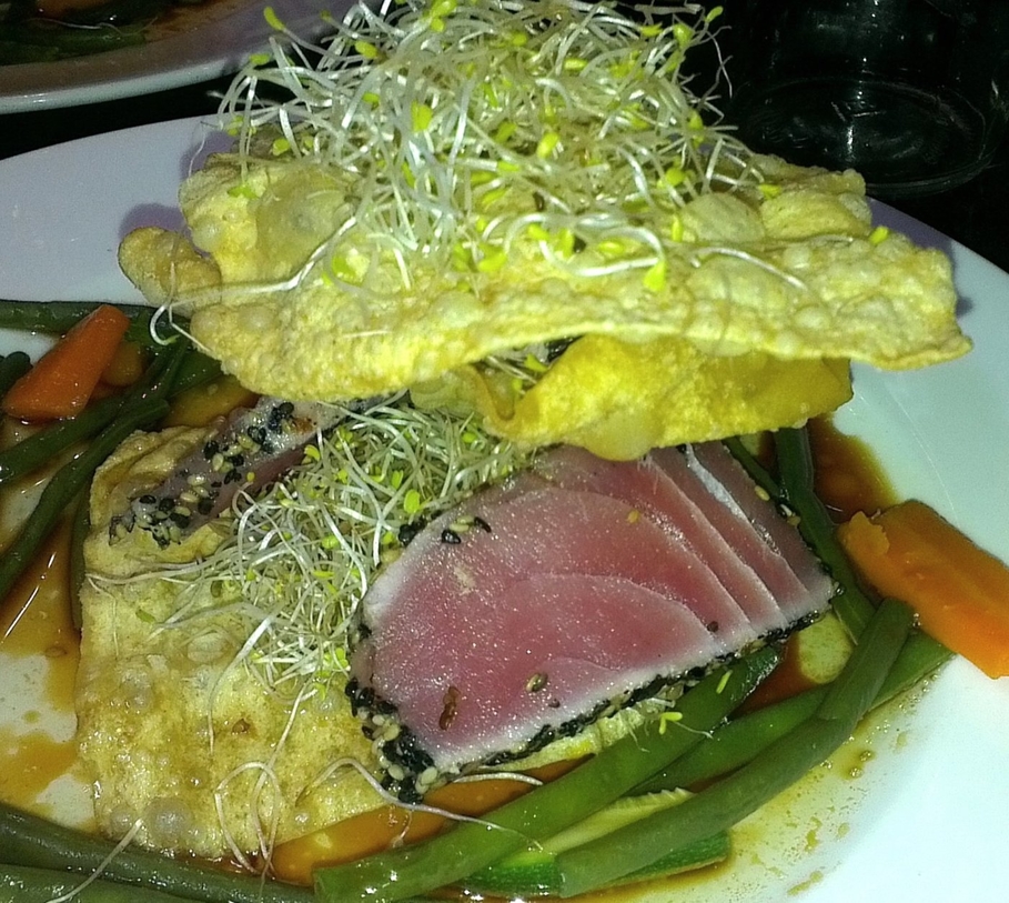 Le millefeuille de thon cru aux petits légumes à la sauce soja japonaise est goûter absolument… et à copier…