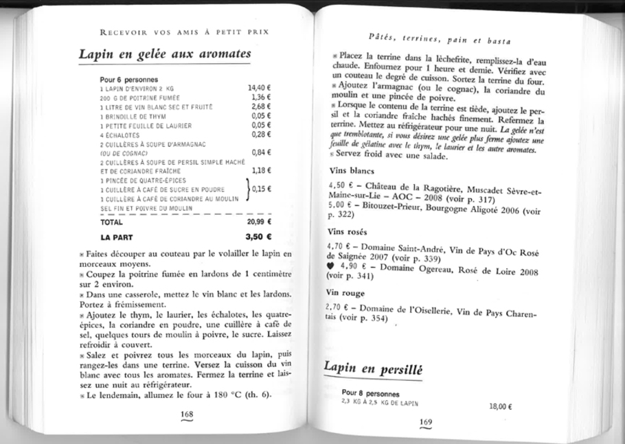 Dans l’ensemble, il s’agit d’une cuisine familiale qui redécouvre une foule d’aliments traditionnels et que je suis loin de renier : beaucoup de potages entre 0,33 et 2 euros, de délicieux ragoûts entre 2 et 4 euros, des terrines de lapin sous leurs différentes formes, etc. Sans oublier des desserts classiques : charlotte au chocolat à 1,07 euros la portion avec sa crème anglaise à 0,27 euros, millefeuille de framboises à 1,16 euro, etc.