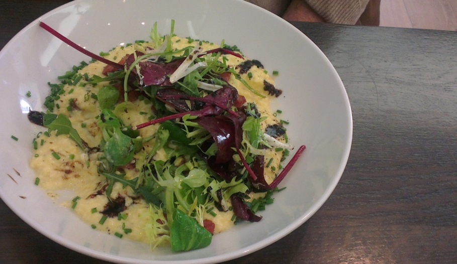 La brouillade d’œufs au chorizo, crémeux exactement comme il faut sont une pure merveille et… oui, le filet de vinaigre balsamique surprend, mais contrebalance intelligemment le piment du chorizo.