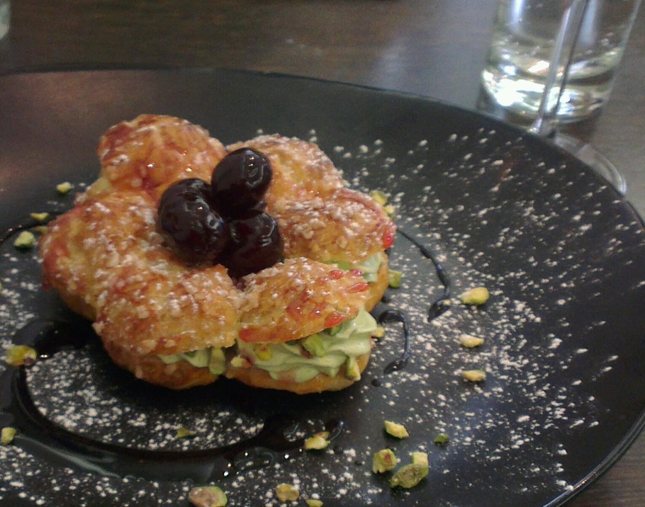 Quant au Paris-La Rochelle, une adaptation du Paris-Brest, la couronne de choux est fourrée de crème fouettée à la pistache, de pistaches concassées et généreusement décorée de cerises amarena. À ne pas manquer.