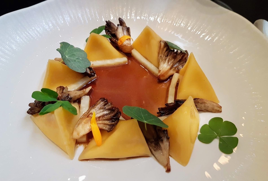 Mais j’ai aussi goûté, parmi les plats signature d’Anne-Sophie Pic, les fameux berlingots. Ce sont des raviolis fermés en pyramide, comme des berlingots, et fourrés d’un coulant au crémeux de chèvre de Banon légèrement fumé. Le tout présenté dans un consommé au cresson infusé au gingembre et à la bergamote. De quoi mettre vos papilles en extase !