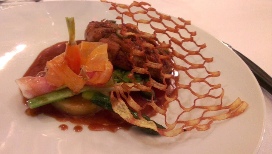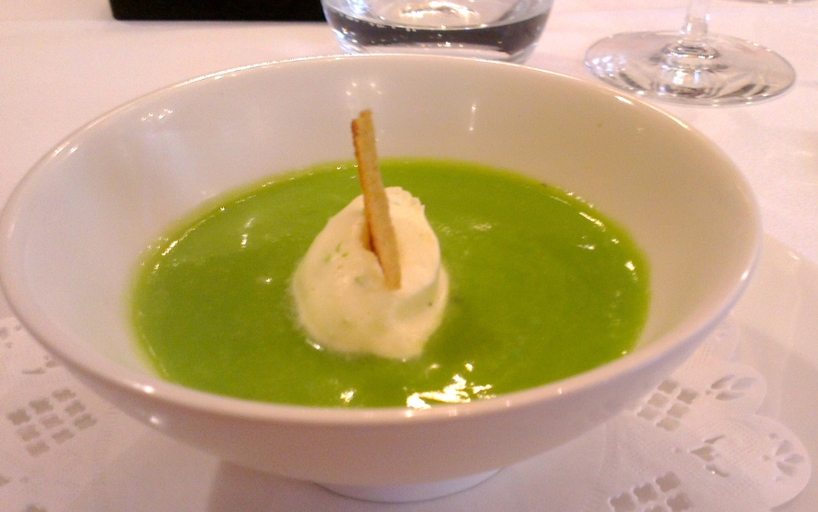 Vous pouvez envisager de vous passer d’entrée puisque, à tous ces délices, s’ajoute, pour commencer, une mise en bouche remarquable : velouté frais de petits pois avec des dés de tartare de saumon et une quenelle de crème fouettée. Le tout avec un délicieux beurre Bordier au piment d’Espelette avec du pain de première qualité.