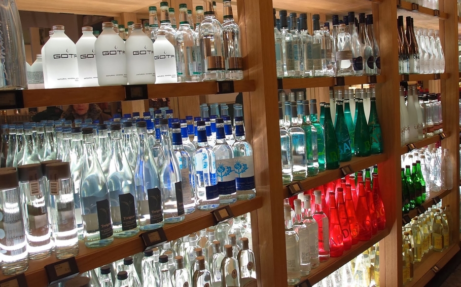 Les produits sont rangés sur des rayonnages à n’en plus finir par catégories : les sels, les poudres chocolatées, les sucres, les gâteaux secs, etc. Jusqu’à cet interminable mur d’eaux de toutes sortes jusqu’à une eau de glacier du Canada à 12,50 euros les 70 centilitres !