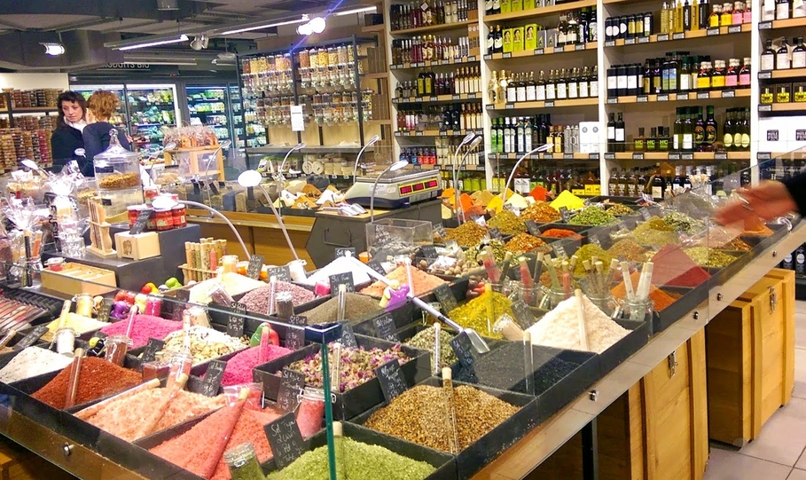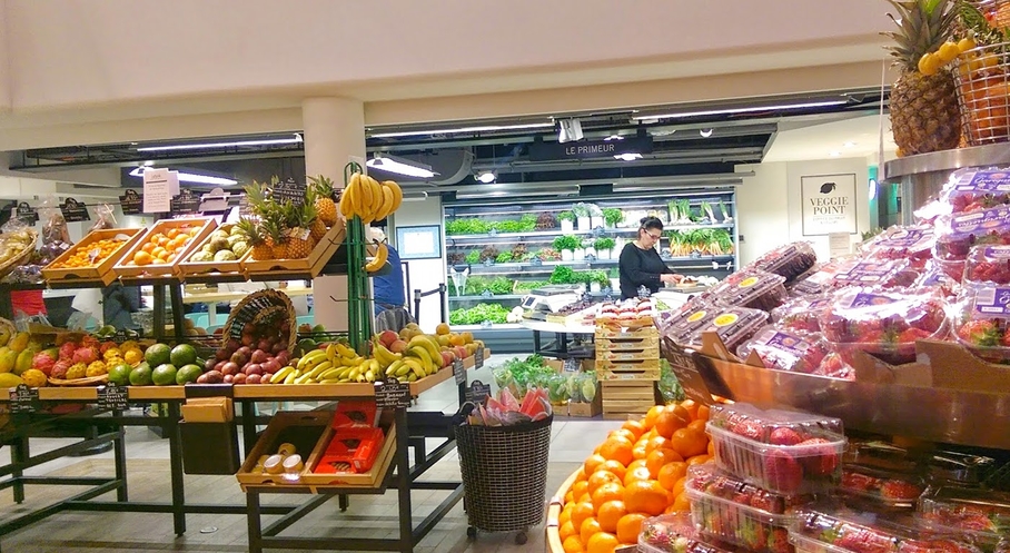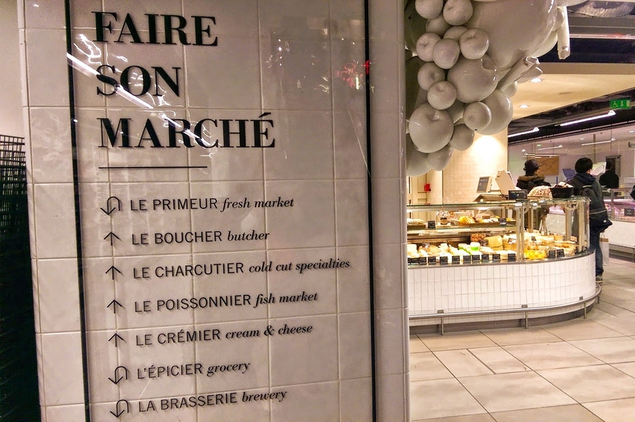 Les concepts de gastronomie du monde et les créateurs se situent dès le rez-de-chaussée : les glaces Pedone avec 18 parfums de glace turbinés sur place, le traiteur grec Mavrommatis, l’espagnol Cinco Jotas, l’italien Salumeria Rosi, un traiteur japonais, un chinois, sans compter un espace de restauration rapide Prêt à manger.
