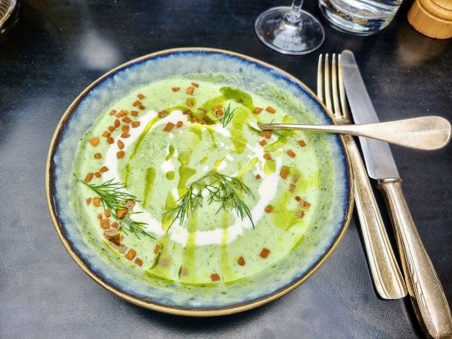 Nous avons goûté une merveille de brouillade d’œufs à la truffe noire (du jus) et ciboulette et le croque Monceau à la truffe (comté, jambon blanc et mesclun), magnifiquement grillé, avec les meilleurs produits. La soupe glacée de concombre à la crème de feta, concombres en pickles, petits croûtons fera bientôt partie de ma propre carte et la dorade marinée au chalumeau, sur lit de taboulé de boulgour d’Orient, noix et grenade, condiment de kumquat, est la démonstration d’un savoir-faire digne des plus grands.