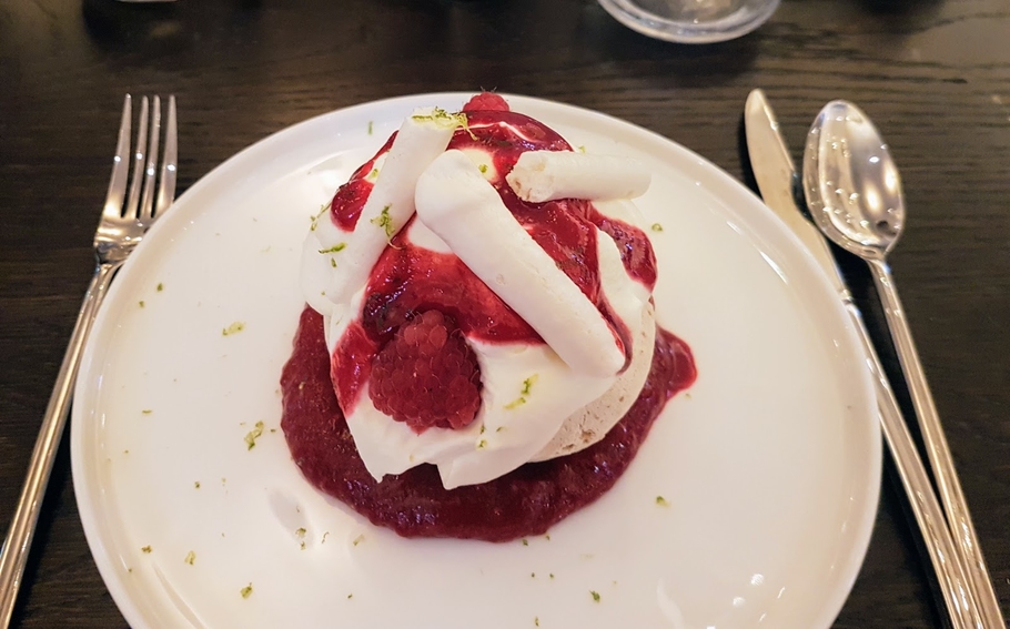 Les fruits rouges au jus d’hibiscus, avec un sorbet à la fraise, un peu moins riches, rivalisent de saveur avec la meringue.