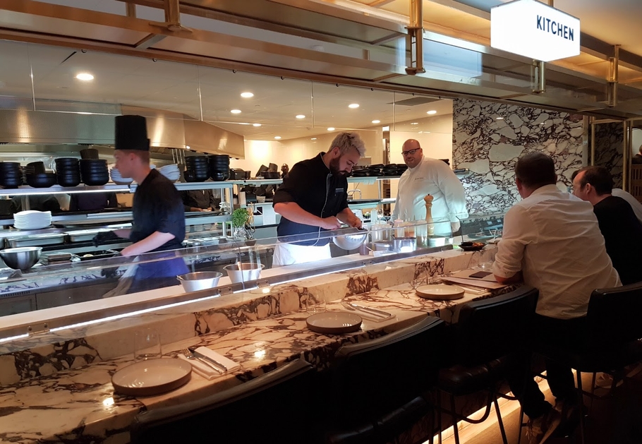 La brasserie se découpe en plusieurs espaces : une terrasse extérieure, une verrière meublée contiguë au restaurant, à l’ameublement similaire. Un superbe bar avec des tabourets permet de savourer les cocktails et la cuisine ouverte, bordée d’un autre comptoir en marbre fait face à la salle. Des cuisiniers tout de noir vêtus s’affairent sous les l’œil du chef, Julien Chicoisne, en blanc.