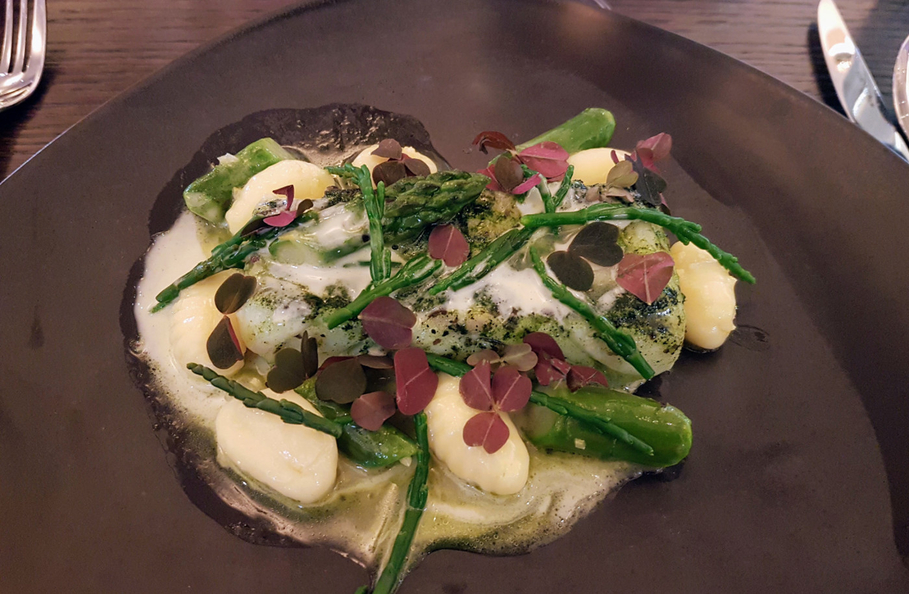 Le cabillaud cuit au plancton marin, avec des salicornes, un des plats “signatures” de la carte, m’a absolument ravie. Le parfum du plancton est inimitable. Pour l’anecdote, je n’avais pas trouvé de plancton pour cuisiner mon orge perlé aux épinards et j’avais réduit de la laitue de mer en poudre. J’ai bien fait puisque le résultat est le même, en tout cas, très proche. Quelques salicornes et des gnocchi en guise d’accompagnement et trèfles pour le décor rendent ce plat léger particulièrement appétissant.