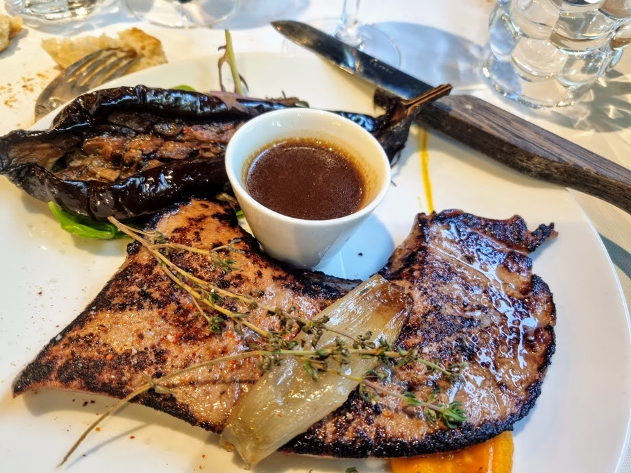 La carte fait évidemment la part belle aux poissons de la région (La Rochelle ou La Cotinière, à l’île d’Oléron), même si, de temps en temps, on peut se laisser tenter par une viande ou un abat, comme le foie de veau surmonté d’un échalion (une grosse échalote) confit et sauce à l’ail noir.
