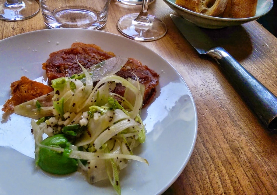 En entrée, Sarah, auteur du blog À croquer, et moi avons opté pour le croustillant de tête de veau. La tête de veau est désossée, pressée, coupée en tranches et, chacune d’elles bien grillée (comme à La Part des anges). La petite salade d’accompagnement m’a séduite : des lamelles de fenouil, de brocolis, saupoudrée des graines de moutarde avec un coulis d’oseille. Ça commençait vraiment bien.