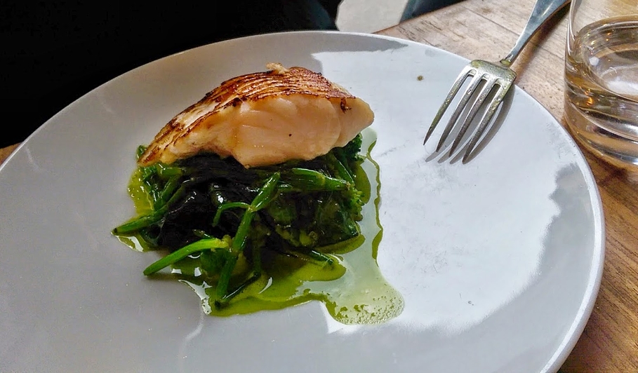 Pour suivre, le pavé de cabillaud, bien grillé était parfaitement (et pas trop) cuit. Peut-être un peu tiède au goût de Sarah… Les légumes étaient encore délicieux : des épinards et de l’oseille à peine pochés avec des brisures de chou romanesco et de brocolis. Impossible de reconnaître la touche d’assaisonnement, mais vous laissez repartir votre assiette absolument vide.