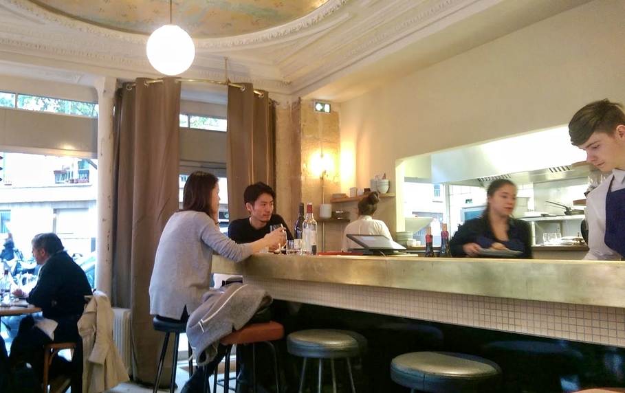 Même pour le déjeuner, ce bistrot est certes plein, mais la vingtaine de tables sont raisonnablement espacées. Le sol, à petits carreaux années soixante, est resté tel quel, les murs et les plafonds ont été décapés, laissant ressortir deux ciels moulurés, bien plus anciens, ainsi que certaines vieilles pierres, un peu à la manière d’un terrain de fouilles, ce qui n’est pas vilain du tout. Le comptoir contemporain, noir et or, sépare la salle de la cuisine où officient environ cinq jeunes gens appliqués. Trois filles en salle, dont les sœurs aux origines philippines Levha, Katia et Tatiana, la jeune chef.