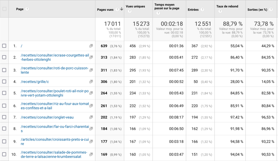 Le meilleur score revient à des recettes mises en ligne depuis largement plus d’un an (souvent publiées dans ma newsletter mensuelle) – comme l’écrasée de courgettes ou le riz au four –, voire plusieurs années (les moules froides, le porc cuisson lente, etc. sans compter la salade de pommes de terre !). Ce qui signifie que Google fouille réellement dans les archives de Mariatotal.
