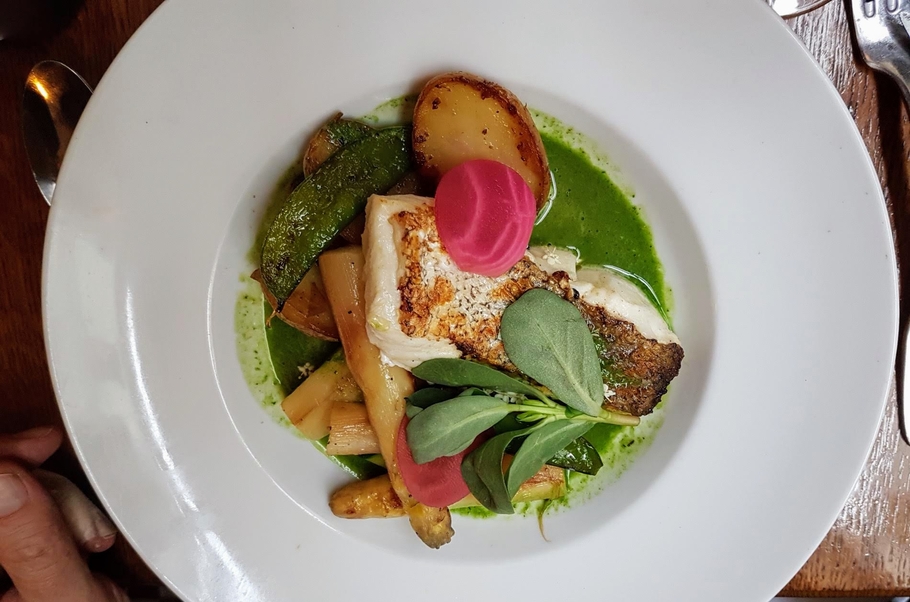 Le merlu sauvage, asperges blanches, grenailles fumées et bouillon d’herbes, très appétissant, a beaucoup plu à l’un de mes compagnons.
