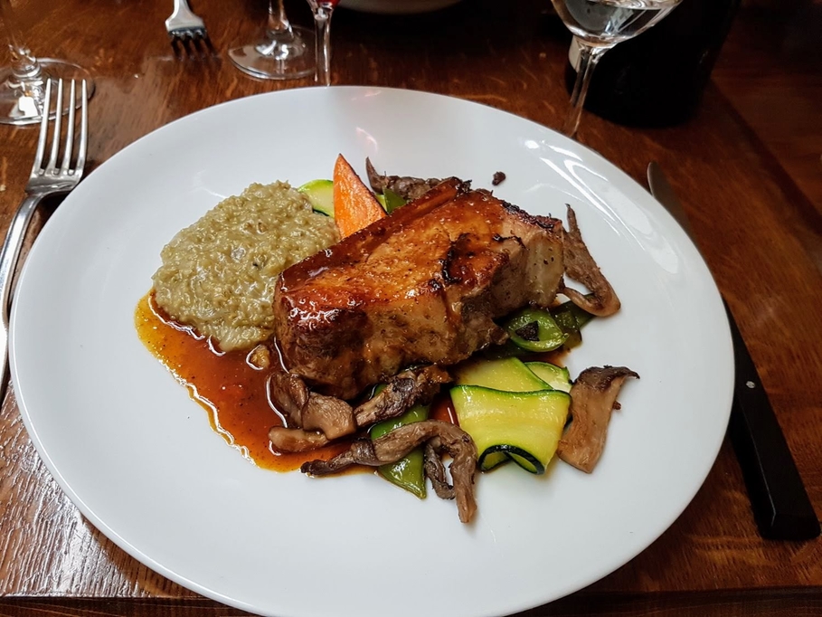 Il m’est arrivé de continuer par un plat classé dans les entrées, un joli tataki de veau, admirablement présenté, mais lorsque je suis revenue, j’ai dégusté une poitrine de veau à la plancha, jus aux épices, formidablement cuite, ni trop ni trop peu. Des produits de saison et de première qualité.