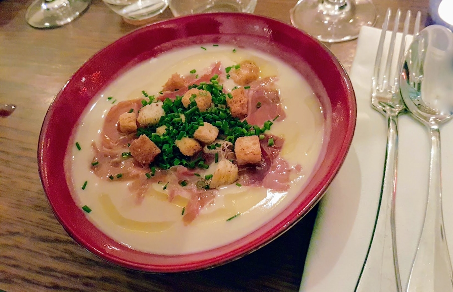 Pourtant, nous avons opté pour son non moins savoureux velouté de topinambours, œuf parfait et jambon Serrano et sa remarquable terrine de gibier maison au cognac, assez maigre et raisonnablement corsée.