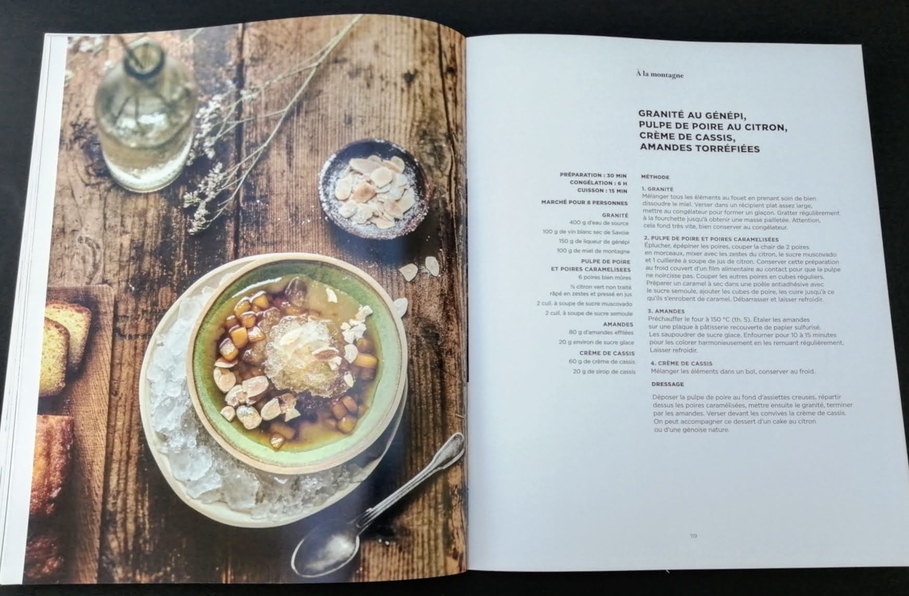 À la montagne, c’est une crème de champignons de Paris au curry doux ; une fricassée de volaille aux oignons blancs ; un foie de veau rôti au beurre mousseux et têtes de champignons de Paris ; un carré de porc au sapin, marmelade de chou rouge aux myrtilles ; un granité de génépi, pulpe de poire au citron, crème de cassis, amandes torréfiées ; un gâteau de Savoie à l’orange.