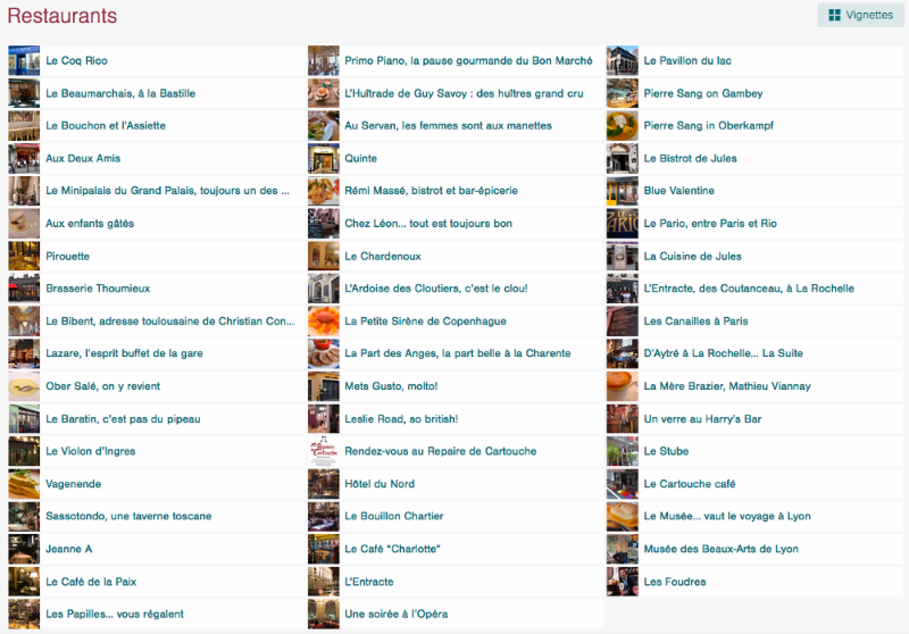 Dans la rubrique “Articles”, vous avez aussi ce bouton “Index”. Si, précédemment, vous avez choisi l’onglet “Restaurants”, les critiques de restaurants s’affichent, cette fois, par ordre chronologique. De même pour les “Bonnes adresses”, “Astuces”, etc.