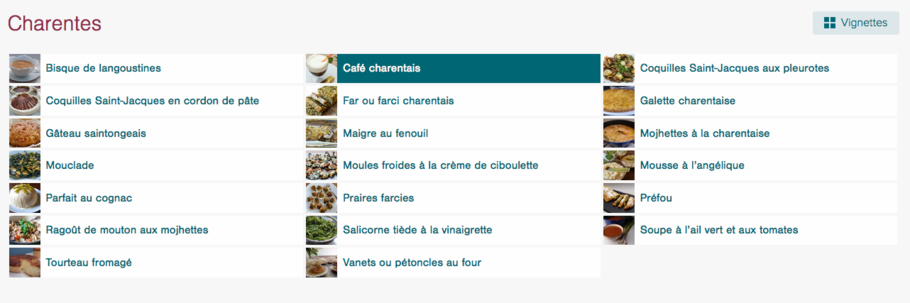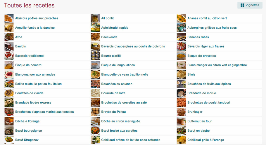 Si vous désirez revenir au défilé habituel des recettes, avec des photos au plus grand format, cliquez sur “Vignettes” (avec un pictogramme de 4 carrés) à l’endroit où ce bouton indiquait précédemment “Index” (avec un pictogramme évoquant une liste).