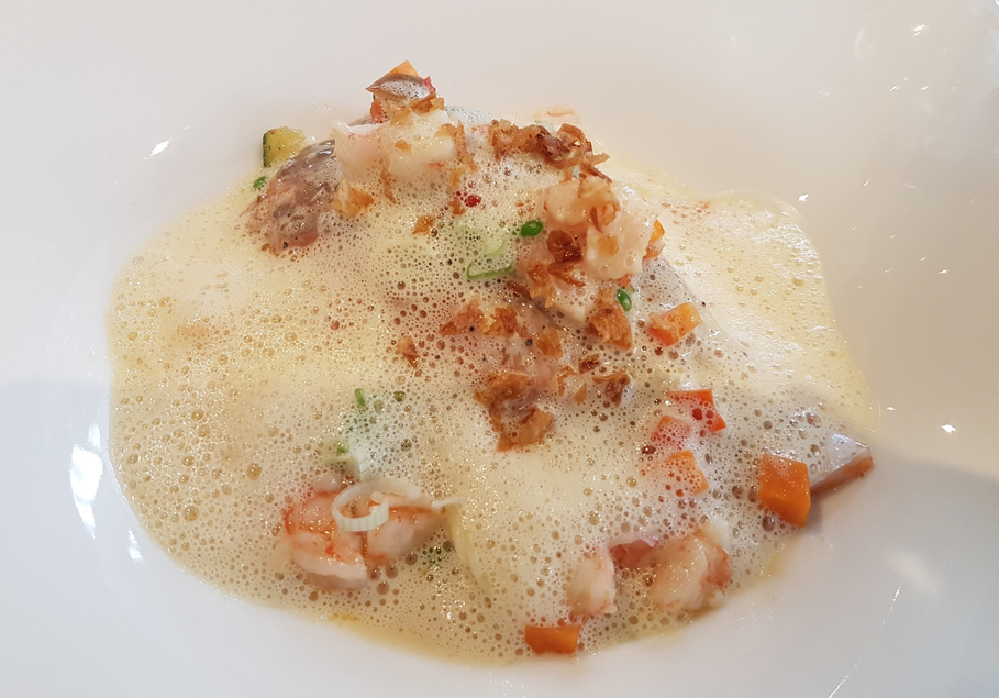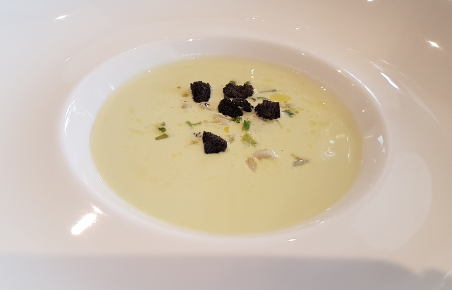 Et la crème froide de soja fève parsemée de dés de pétoncle, de tronçons d’asperge verte semi-crue et de croûtons de pain à l’encre de seiche, d’une fraîcheur absolue, est carrément renversante ! À recopier absolument si j’y arrive.