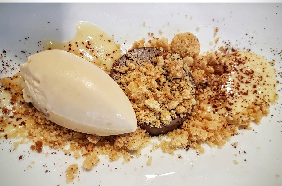 La ganache au chocolat noir et crumble, avec une crème de yuzu et une quenelle de glace pamplemousse parachèvent à la perfection ce repas Quant à la mousse de yaourt avec compote d’abricots et sorbet, financier à la banane, elle, est était inégale. Le financier à la banane ne m’a pas laissé un souvenir impérissable, alors que le sorbet à l’abricot et la mousse de yaourt révélaient une légèreté idéale en cette fin de repas.