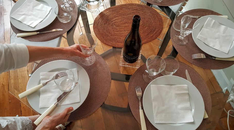 Un repas familial, c’est très chaleureux, il suffit d’ouvrir une bouteille (ah oui, quand même, il faut trinquer à l’amitié, l’amour, la joie, etc. !) d’un petit vin de pays, de mettre de simples sets de table et des serviettes, même en papier, et de passer un bon moment ensemble. Les éclats de rire complices ne sont-ils pas l’essentiel ?