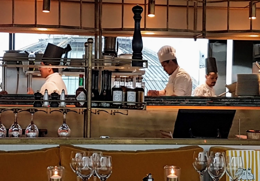 Comme le soleil ne brille ni toute l’année ni tous les jours, ne soyez pas déçu de vous replier à l’intérieur où la décoration allie le confort à la beauté : fauteuils profonds jaunes et tables rondes ou ovales en marbre vert sur un pied central hexagonal. L’agence W&A (comme Jean-Michel Wilmotte et associés) a totalement restructuré le restaurant existant et c’est l’agence Toro & Liautard (comme Hugo Toro et Maxime Liautard) qui a été chargée de l’aménagement du restaurant et de sa terrasse. Voilà pour le name dropping.