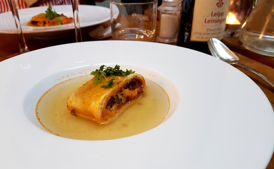 Deux d’entre nous quatre ont choisi la raviole de queue de bœuf dans son consommé. Comme j’apprécie la queue de bœuf, j’ai beaucoup aimé cette entrée toute simple : un rouleau de pâte (à pâtes !) fourrée des filaments de viande dans son bouillon. Parfumé, léger, l’exacte entrée en matière qu’il fallait par ce mois de juin glaçant. La soupe à la courgette et ricotta et la tourte au confit de cochon (une belle part) avec un peu de salade étaient évidemment très réussies aussi.
