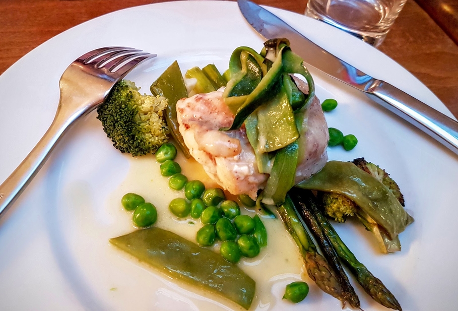 Le poulet cocotte à l’estragon, fenouil, artichaut et citron confit, était aussi très bien servi et nos trois filets de lotte beurre blanc au safran et légumes verts étaient tout simplement une perfection de cuisson. La lotte, cuite à point, et les légumes – asperges vertes, bouquets de brocolis et petits pois – étaient grillés, croquants, mais pas trop. Le tout délicatement parfumé, rendant le jus dégagé absolument addictif.