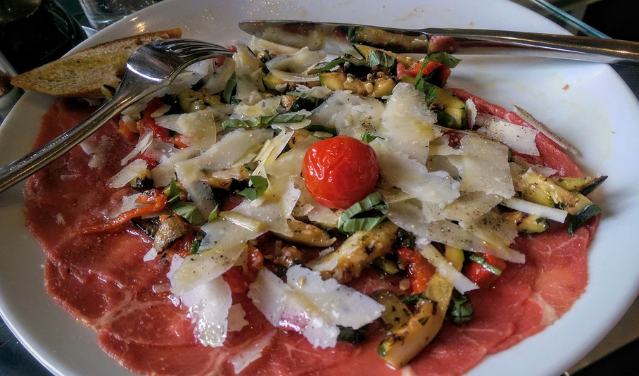 Mais, non, j’ai pris un des plats du jour, le carpaccio de bœuf avec des légumes grillés parfumés à souhait et encore des lamelles de parmesan. J’ai rarement mangé un carpaccio aussi parfait, avec des tranches de bœuf d’une épaisseur idéale, de sorte que la saveur de la viande crue était intacte.