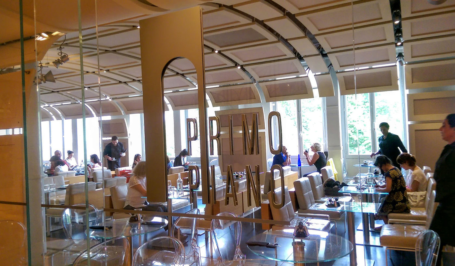Derrière des cloisons de verre, la cuisine italienne de Primo Piano vous accueille devant de belles tables en verre et de confortables fauteuils de cuir blanc.