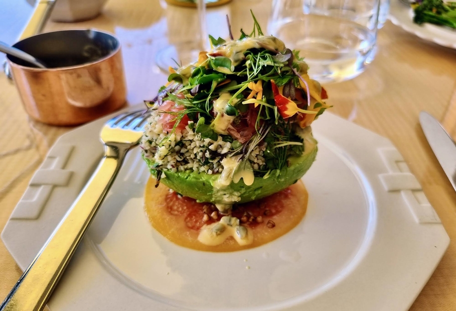 L’avocat, boulgour, pamplemousse aux quatre herbes poivrées et condiment passion se révèle d’une finesse originale, mais pas trop.
