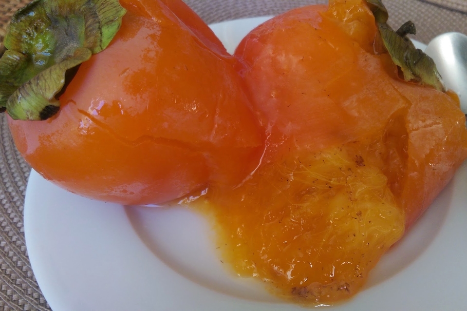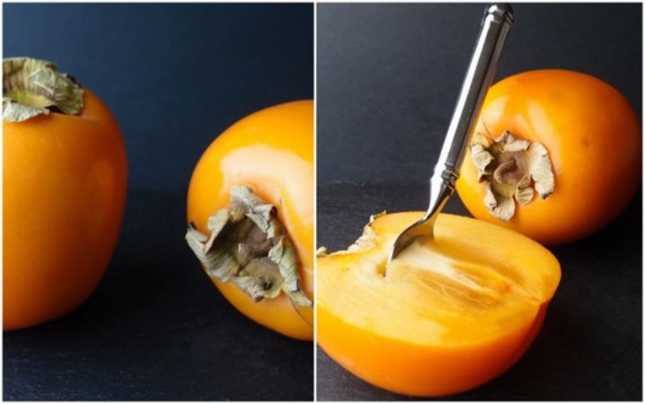 Le kaki “persimmon”, à chair plus ferme, se répand de plus en plus, comme, ici, sur les deux photos du haut. Son parfum est le même, mais d’une saveur nettement moindre. On peut croquer comme une pomme, d’où son appellation, parfois, de “kaki pomme”. Essayez tout de même.