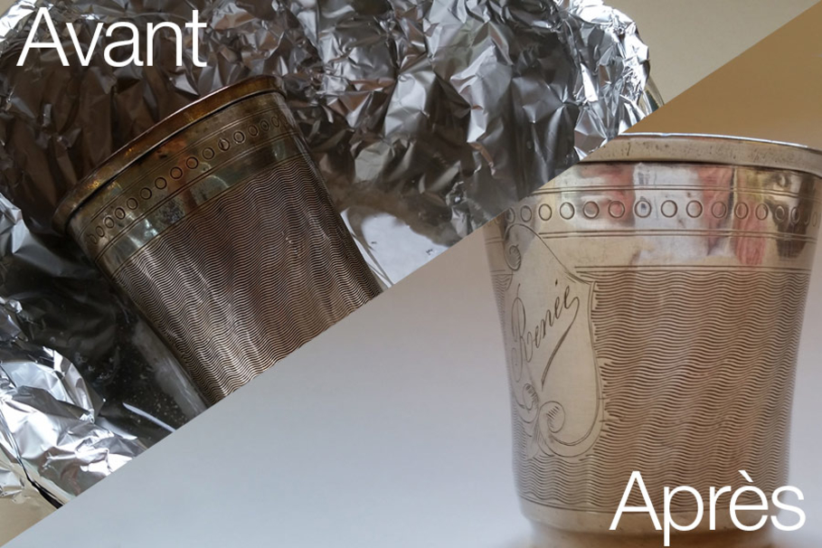 • Pour raviver votre argenterie, faites tremper vos couverts (ou bijoux) dans un plat classique en verre ou en porcelaine chemisé d’une grande feuille de papier d’aluminium, remplissez-le d’eau chaude et ajoutez 1 cuillerée à soupe de bicarbonate (ou, à défaut, de sel). Laissez tremper une dizaine de minutes. Ne soyez pas surpris, ce mélange dégage une odeur épouvantable (comme ce produit vendu dans le commerce, dans lequel on trempe son argenterie qui en sort immédiatement nettoyée). Le noir s’en va. Brossez éventuellement avec une vieille brosse à dents. Rincez et essuyez. (en photo, une timbale très ternie, est ravivée)