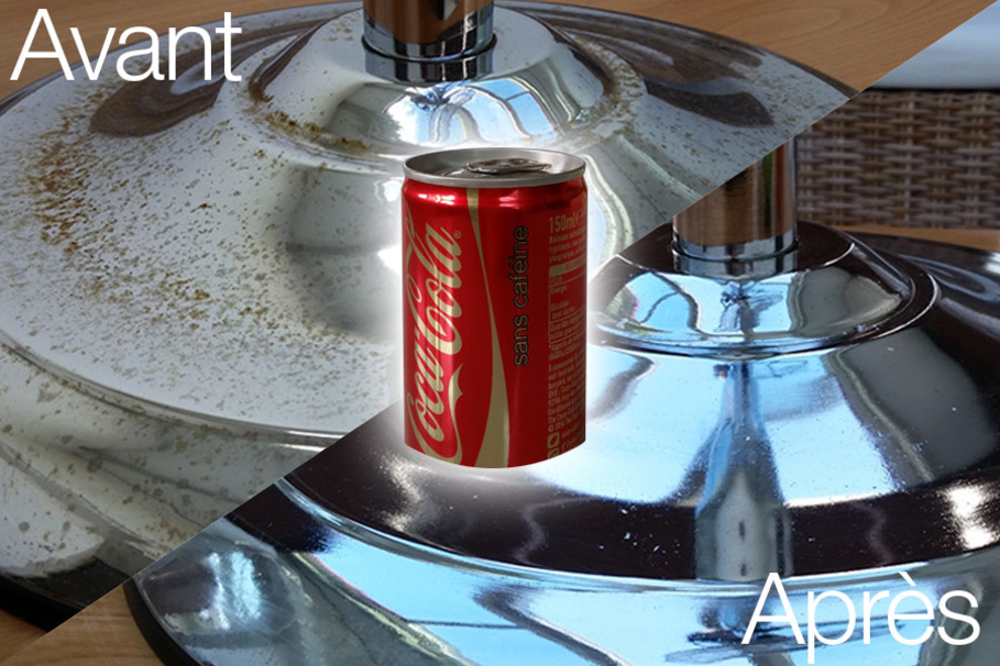• Pour ôter les piqûres de rouille de vos surfaces chromées, frottez-les avec une feuille de papier d’aluminium froissée trempée dans… du Coca-Cola qui, en plus de désaltérer, a décidément de multiples vertus ! C’est spectaculaire. (en photo, un pied de ventilateur, piqué de rouille, a retrouvé une nouvelle jeunesse)