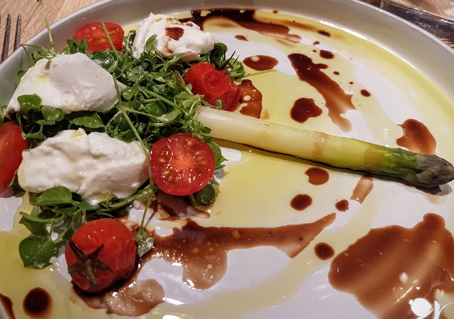 Je me suis régalée d’une assiette composée d’une belle asperge unique (évidemment, c’est surprenant) garnie de tomates cerises, les unes crues, les autres rôties, de mozzarella et de pourpier. Le tout arrosé d’une simple vinaigrette. L’ensemble de ces excellents produits mis en scène donnait savoureuse une entrée en matière.