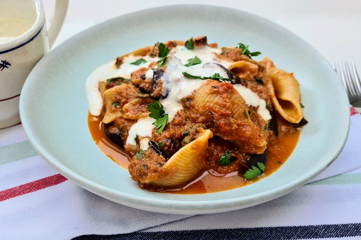 Une belle recette signée Yotam Ottolenghi, publiée dans “The Guardian”, pour ces jolies pâtes en forme de coquillages. Les ingrédients sont vraiment faits pour moi : aubergines, poivron, tahin (ou tahini), etc. Les légumes grillés donnent à cette sauce une réelle profondeur et un vrai fumé. Mais, franchement, telle qu’Ottolenghi transcrit sa recette, il y a de quoi se décourager, mais c’est vraiment très très bon ! J’ai essayé de l’expliquer plus simplement en regroupant logiquement les étapes.
