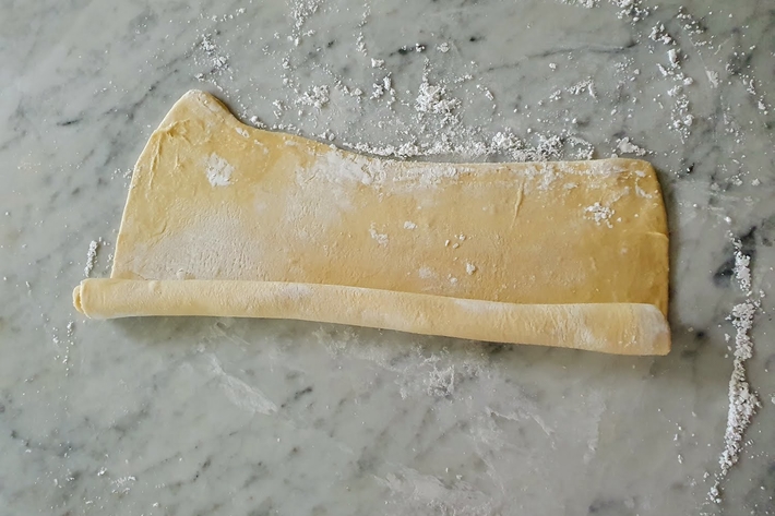 Roulez la pâte bien serrée, recouvrez-la du reste de sucre glace du plan de travail.